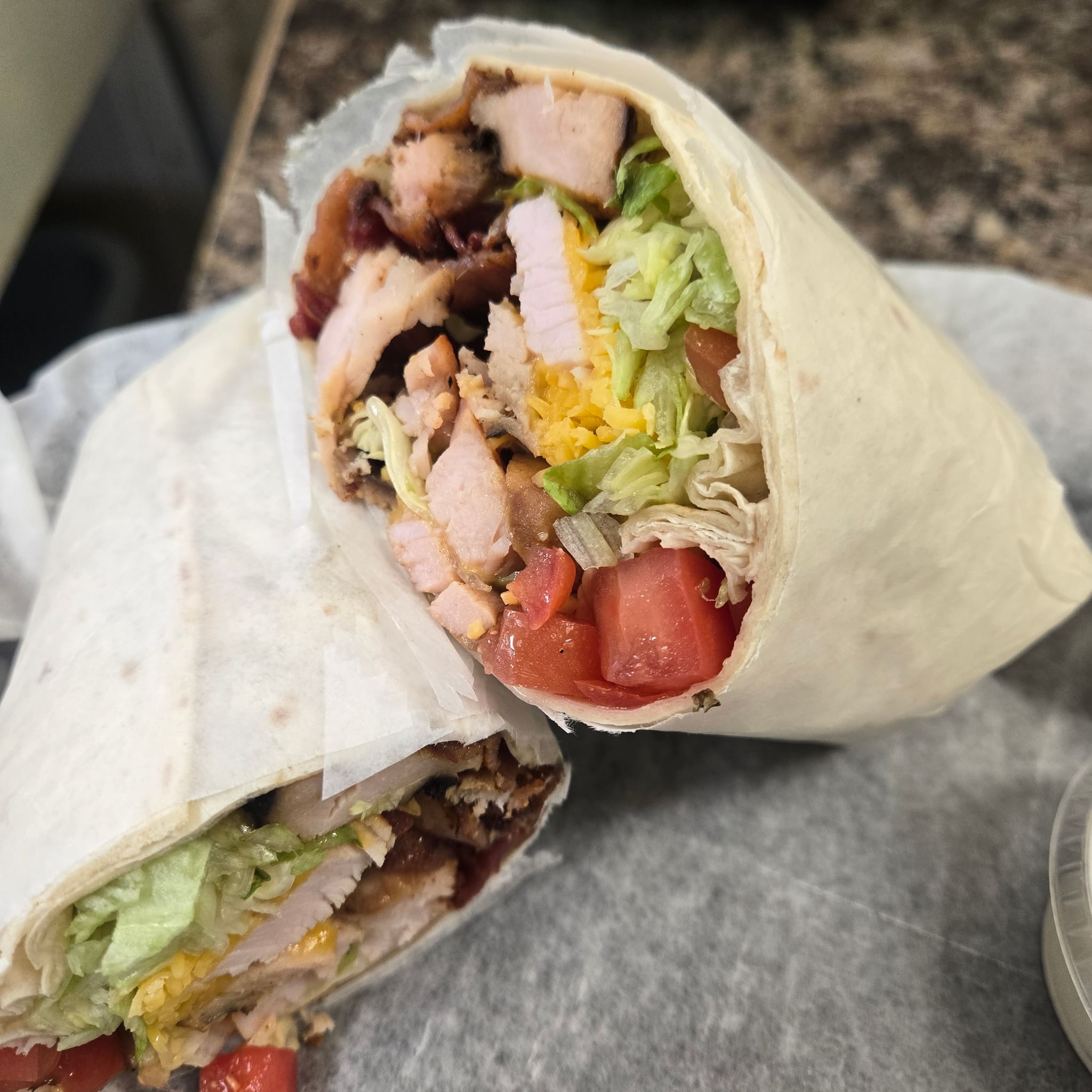 Grilled chicken or house-smoked turkey with bacon, lettuce, tomato, and cheddar cheese. choice of ranch or chipotle ranch dressing.